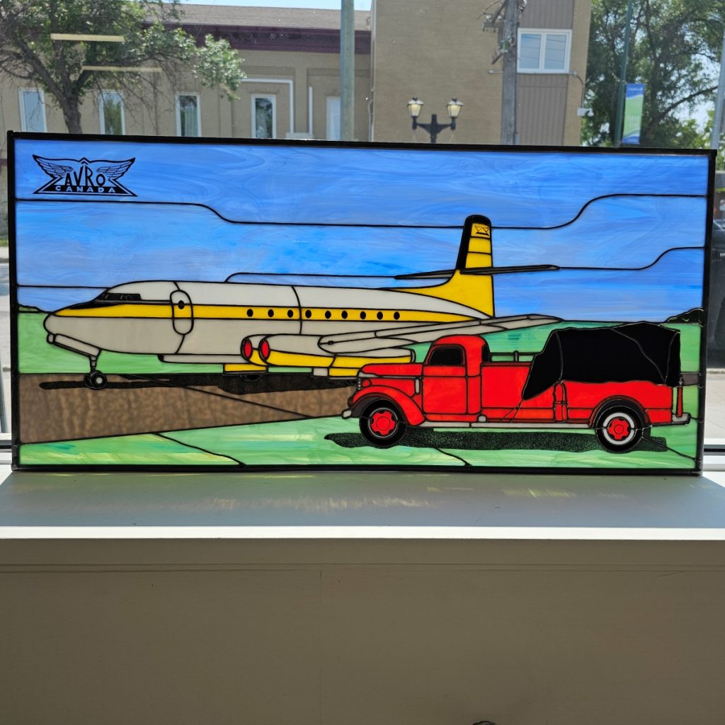 A one of a kind stained glass piece featuring the iconic Canadian-built 1949 Avro C102 Jetliner.