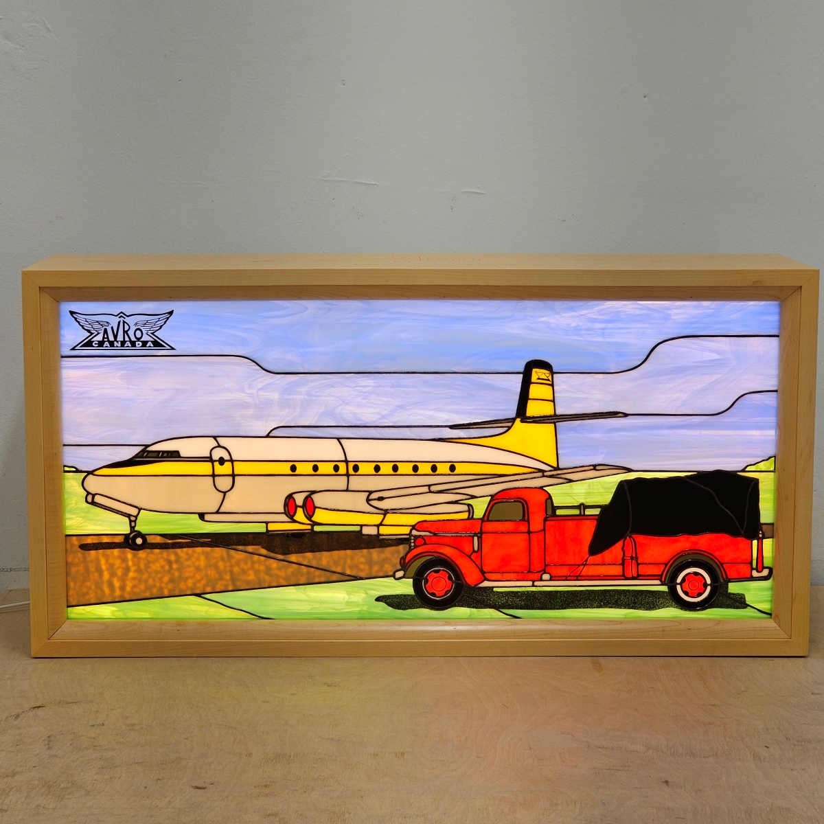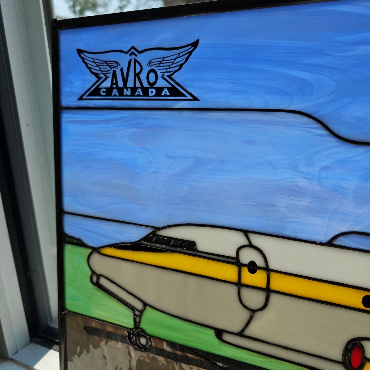A one of a kind stained glass piece featuring the iconic Canadian-built 1949 Avro C102 Jetliner.