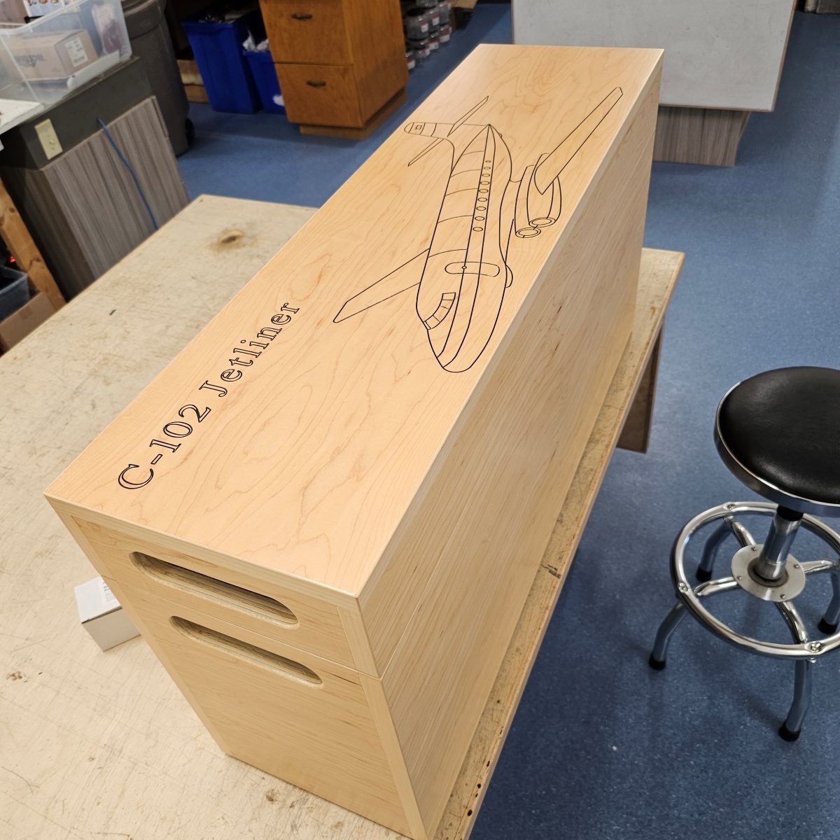 The client had a custom maple wood light box made by a local cabinet maker with a matching maple carrying case both of which were engraved with the Avro Logo! We then installed the stained glass and high output LED lighting into the cabinet. This will allow this piece to be backlit and displayed anywhere in the client’s current and future homes with no need for sunlight.