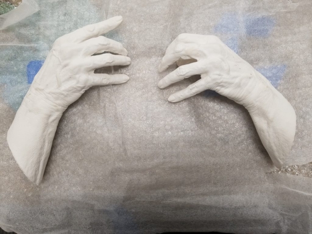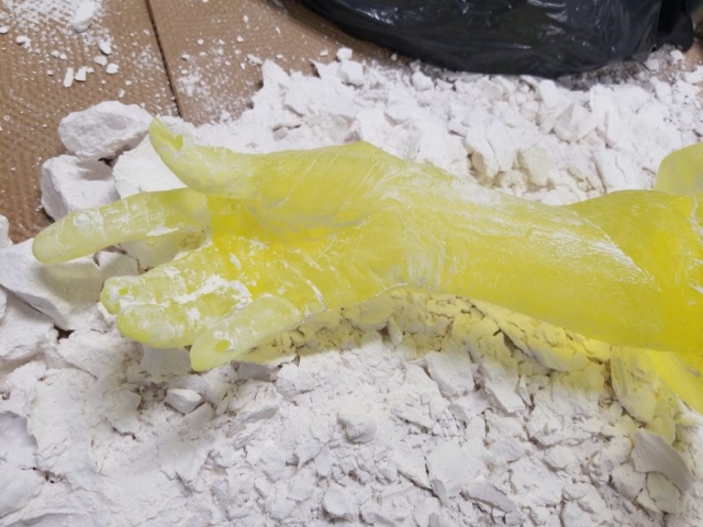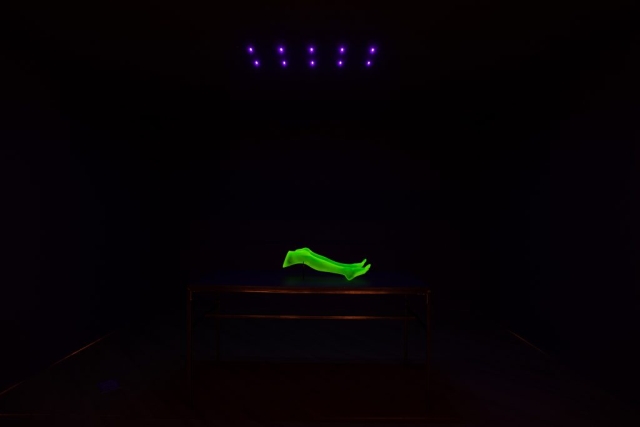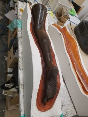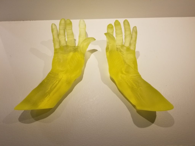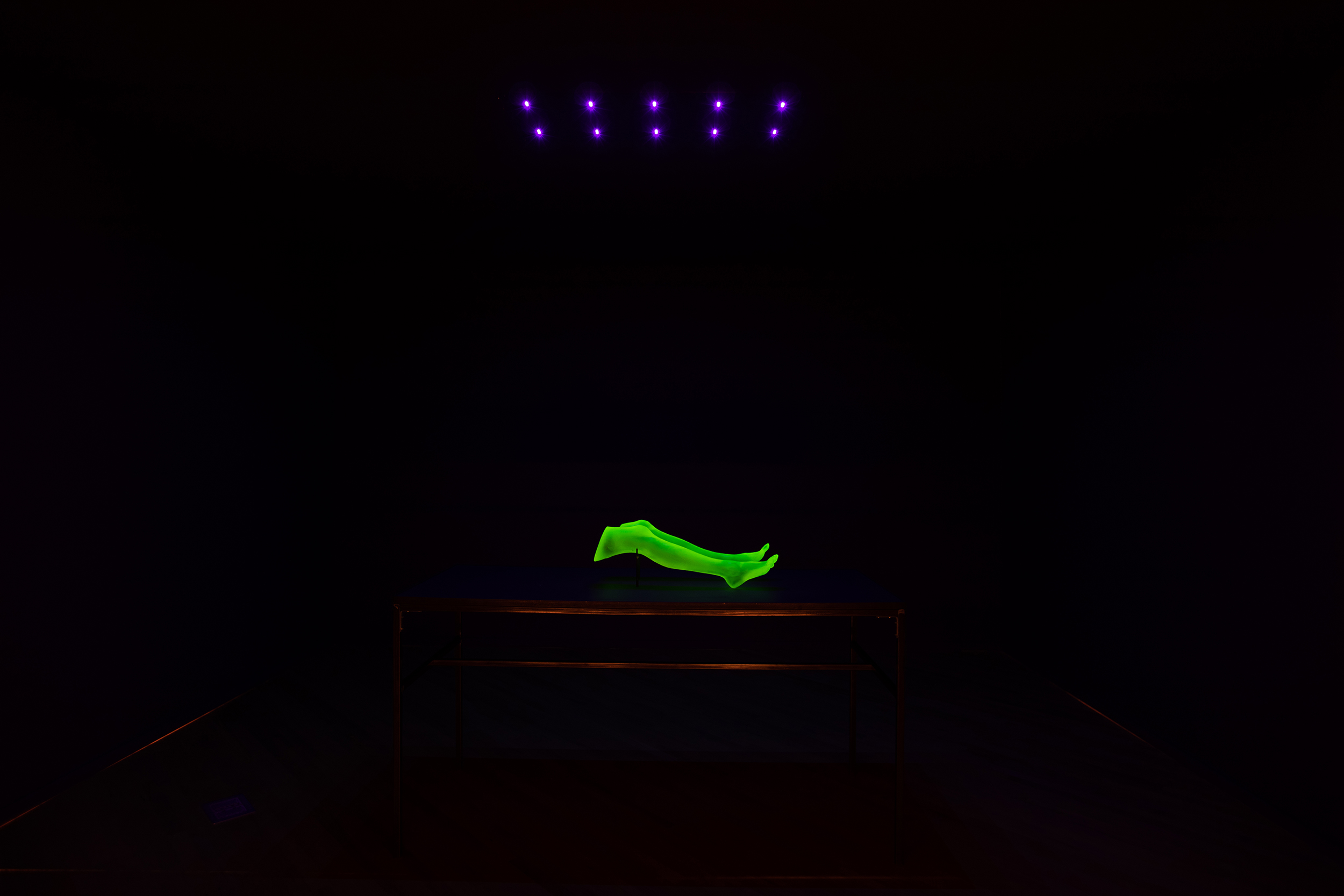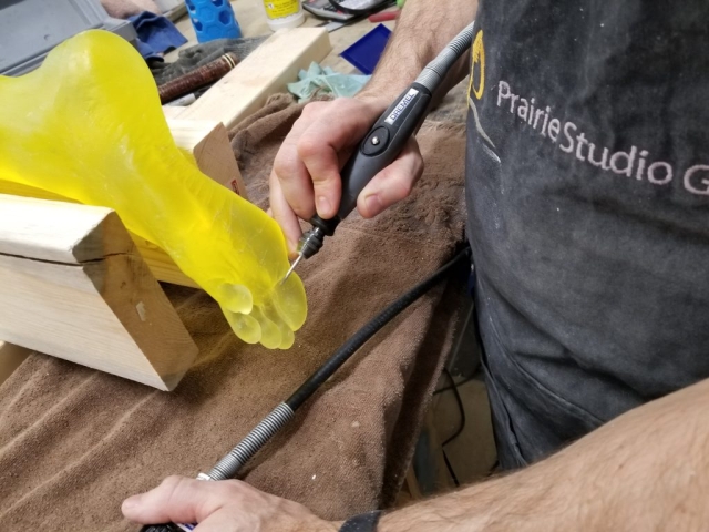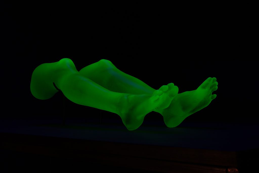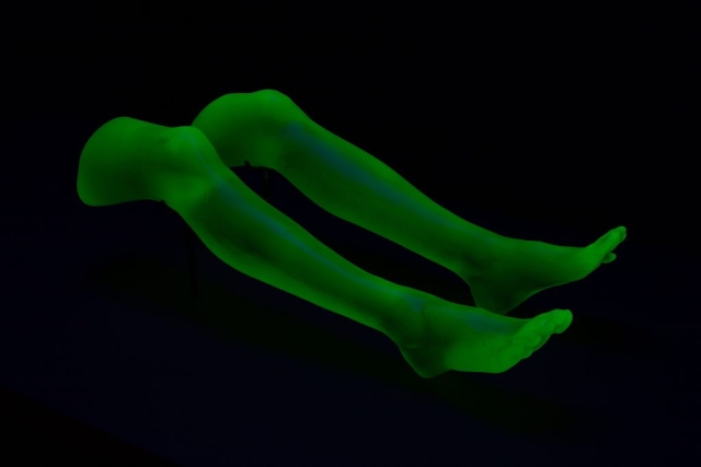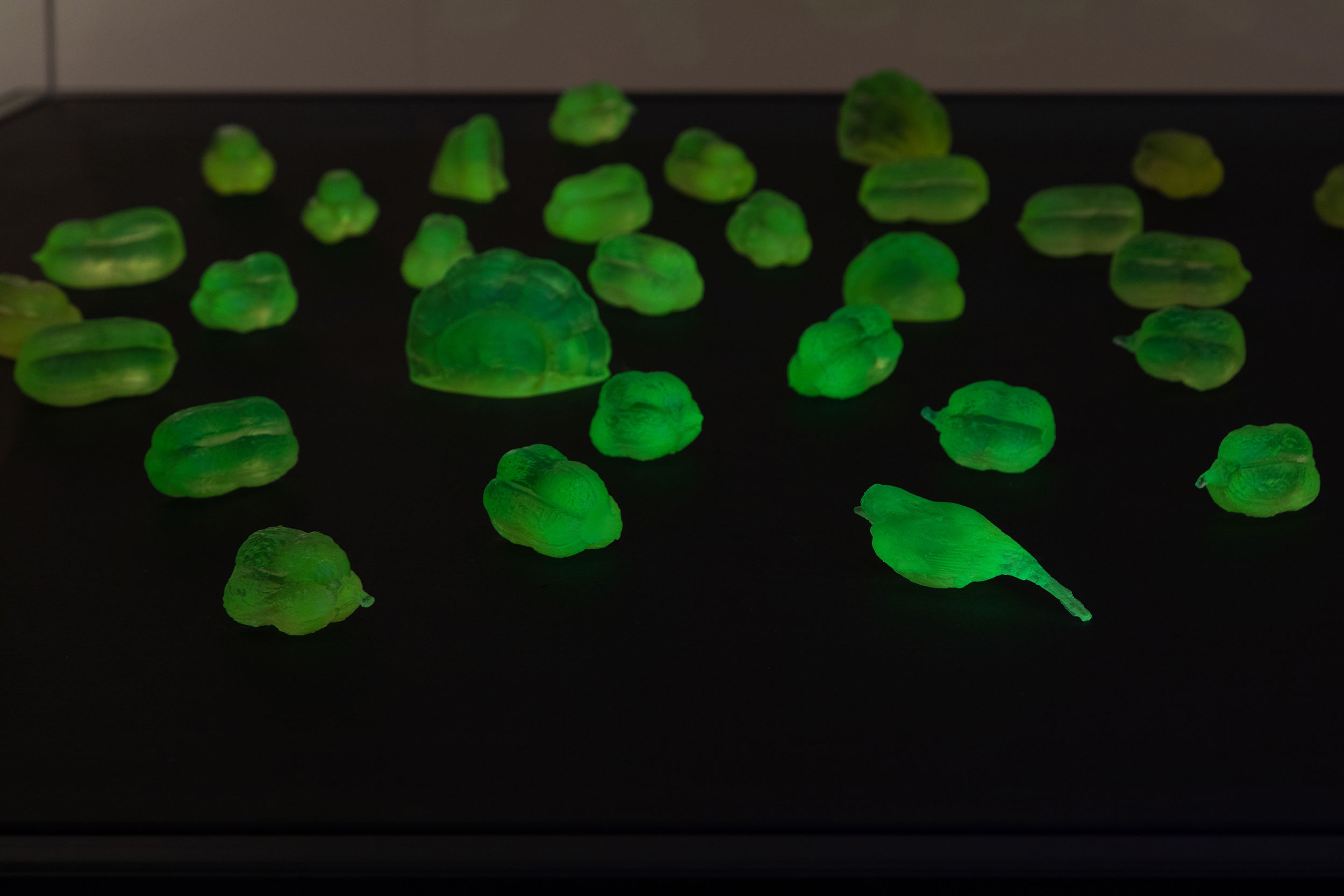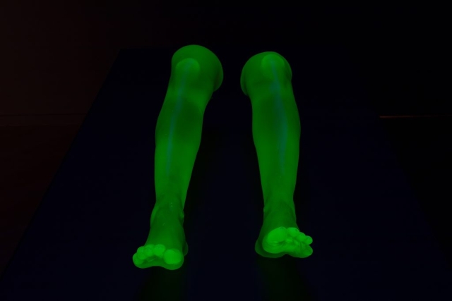We produced over 24 cast glass objects of actual field samples sent to us by Mary, such as yucca seed pods, song birds, fungi and also a set of full size legs and hands all of which were cast in a radioactive glass that is made with Uranium Oxides, which glows radioactive green when lit with UV light.