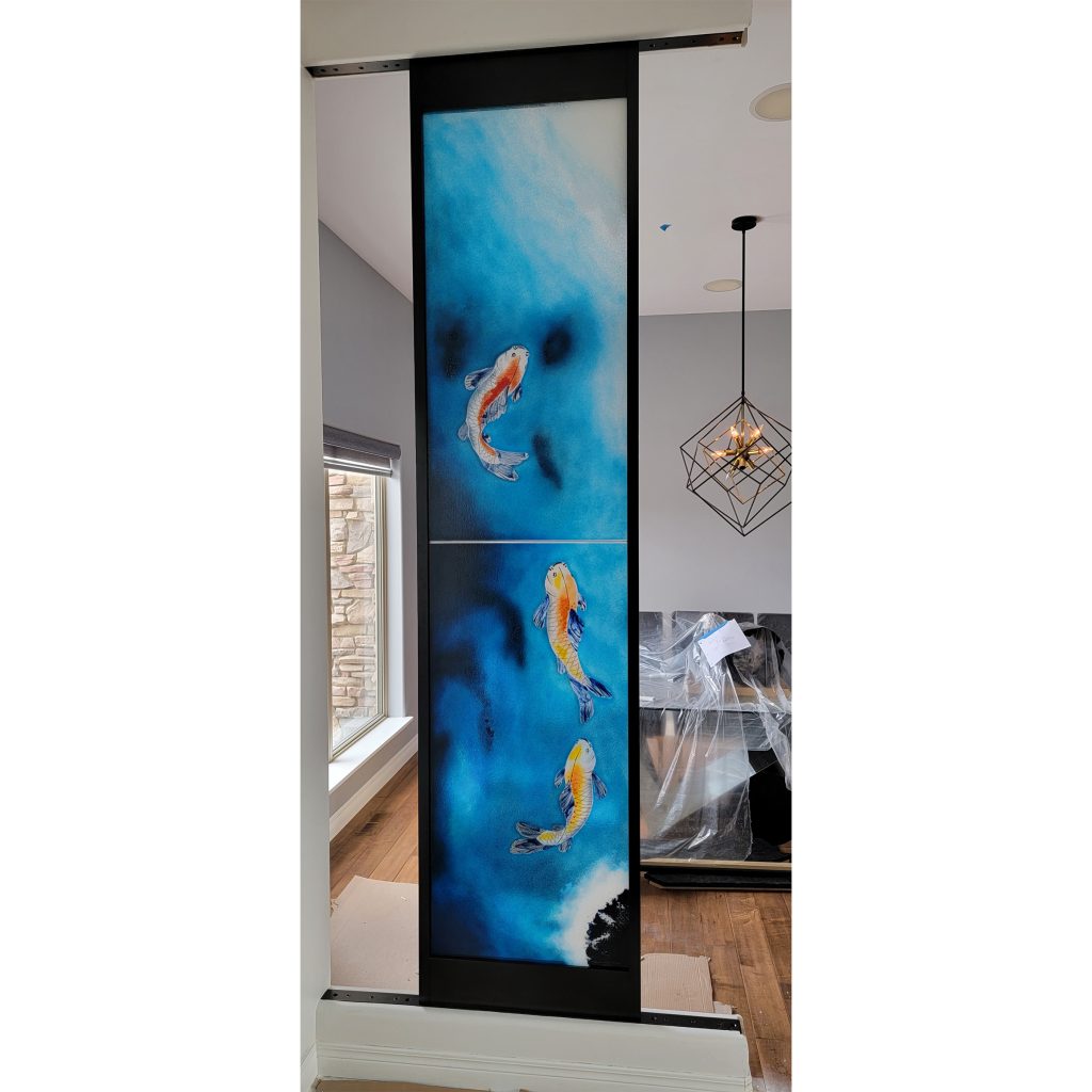 This piece is about 10 feet tall and 2 feet wide, featuring a trio of Koi fish set on a dramatic back drop shifting from deep inky blue to a white washed shore line. This piece was kiln cast glass in two sections and set into a custom aluminum frame, to allow for a sturdy floor to ceiling mounting of the glass.
