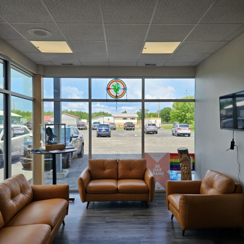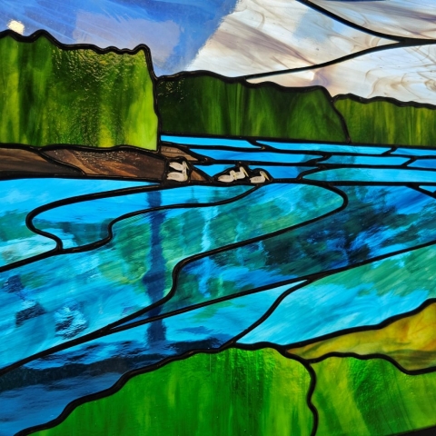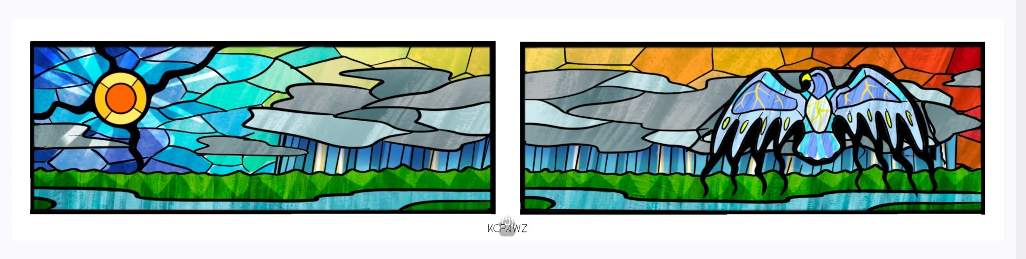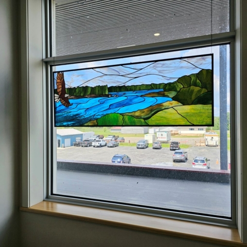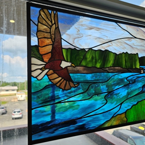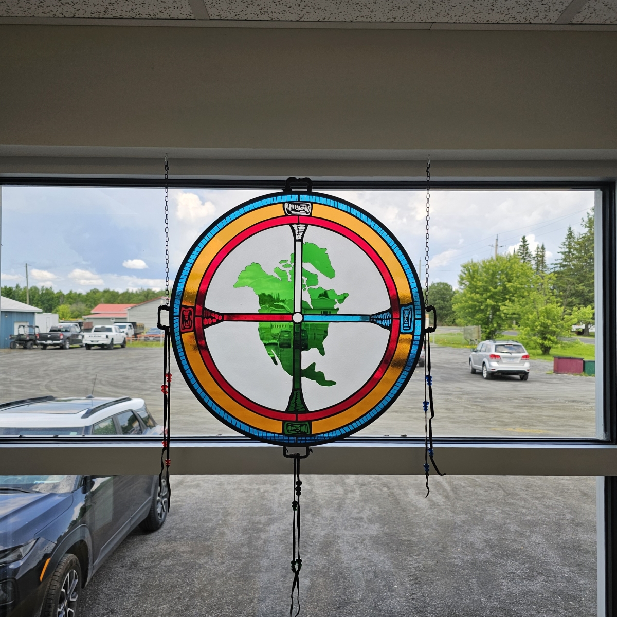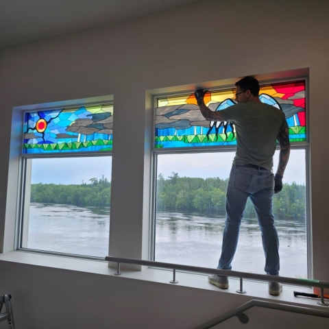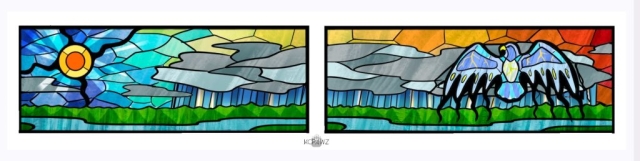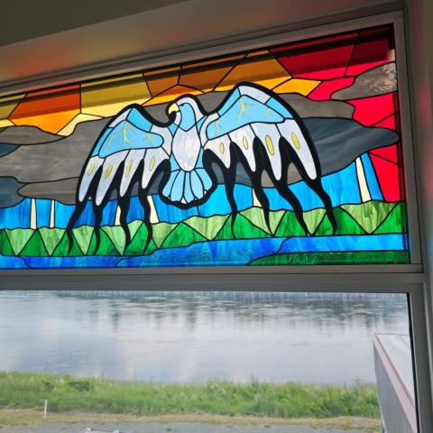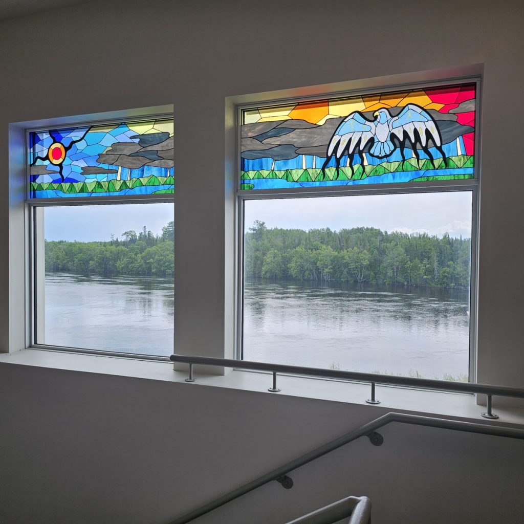 We were commissioned to create a set of 5 windows which we recently installed at the band office of Rainy River First Nations in Northern Ontario. The office asked us to custom create windows for the newly built head office. The first window was a stained glass piece based on the office’s view of the rainy river which frequently has pelicans and eagles fishing in it, so they were also included in the design. Next we made two windows for the front lobby that was our glass version of the band logo, complete with hand painted and sand blasted details and we even custom made glass beads strung on hand cut leather! Lastly we worked together with local artist KCPAWS to create the iconic Thunderbird and sun, set on a stormy background. KC did the original artwork in the woodland style and we then enlarged her artwork and made some slight revisions to allow us to render the design in glass. The thunderbird and sun feature fused, hand painted and sandblasted details. The background is a riot of colour which contrasts with the monochromatic storm clouds. This was a fun and in many ways challenging project, but as you know we are always up for a good challenge. The client loves the pop of colour and culture that the new artwork brings to their work space and we thank the Rainy River First Nations for entrusting us with this project.