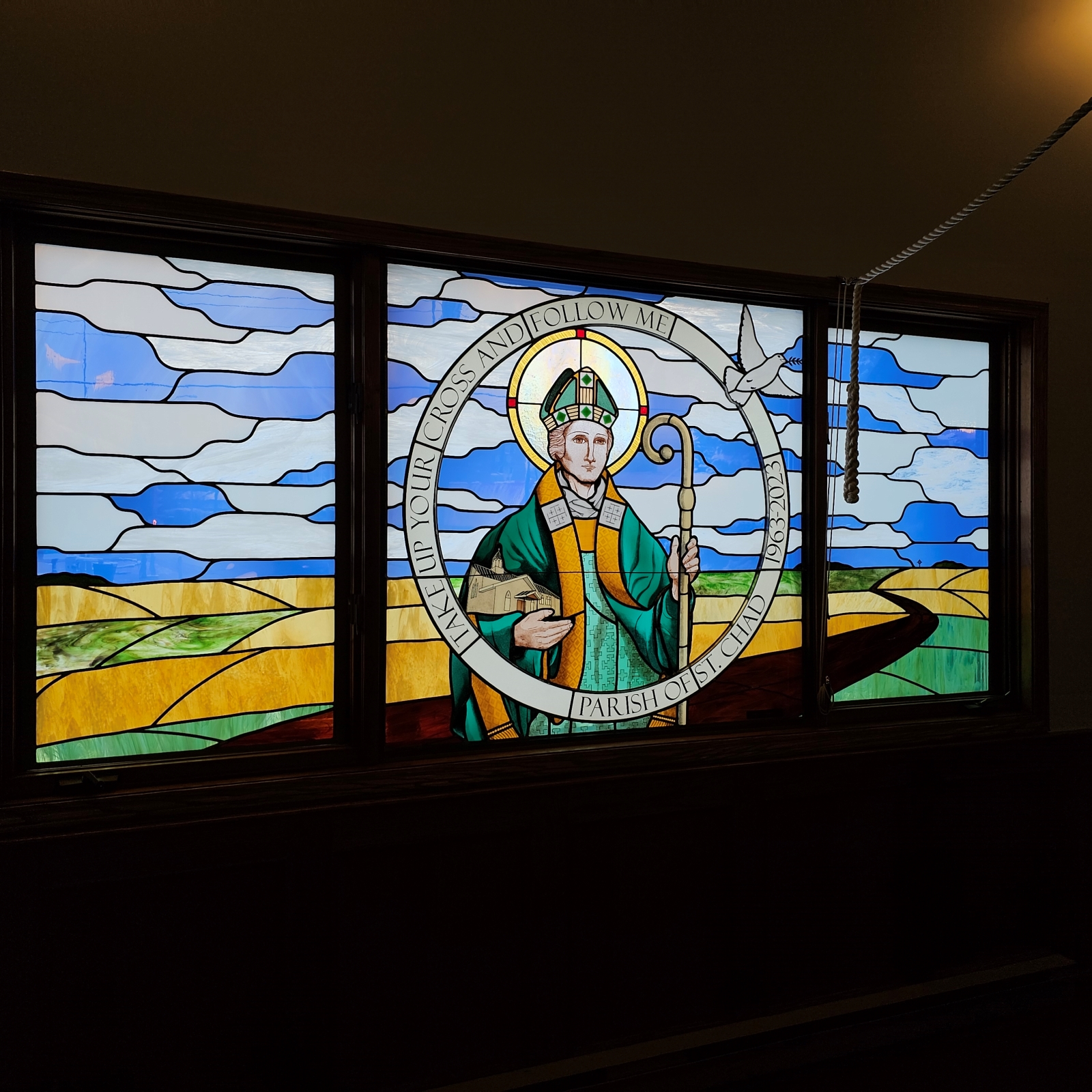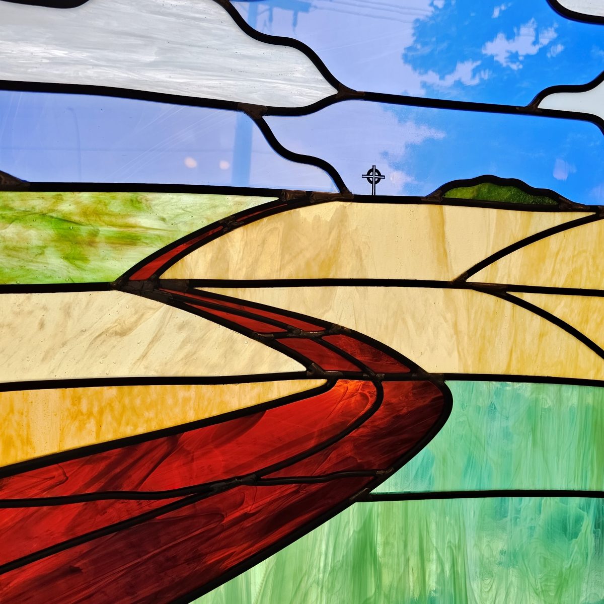 The window depicts St. Chad holding St. Andrews Church in his hand, set in a prairie landscape with a winding road which symbolizes the journey the congregation of St. Chads has made to amalgamate with the congregation at St. Andrews.