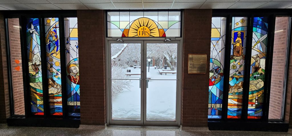 We were commissioned by Interior Designer, Ben Wasylyshen to bring his designs to life in glass for the entry way to the court yard at St. Paul’s High School. Ben has designed a total of 9 windows for the school’s central courtyard entryway. Together we have built and installed 5 of those windows over the past 3 years and have just finished installing windows 6 and 7.