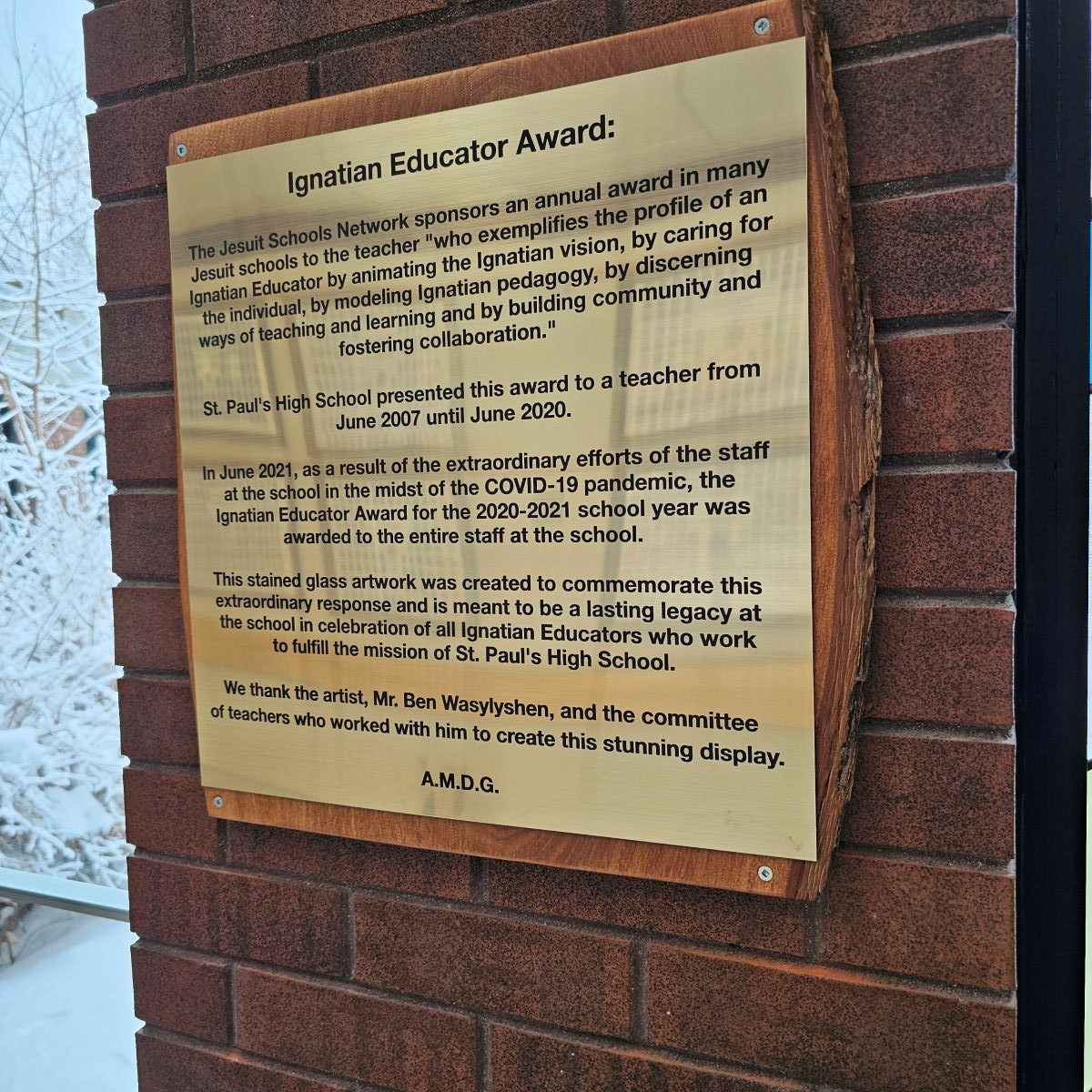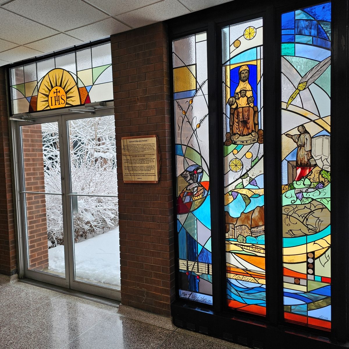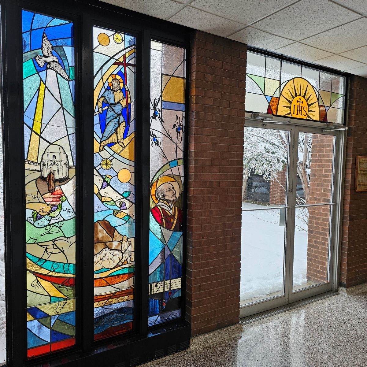 We were commissioned by Interior Designer, Ben Wasylyshen to bring his designs to life in glass for the entry way to the court yard at St. Paul’s High School. Ben has designed a total of 9 windows for the school’s central courtyard entryway. Together we have built and installed 5 of those windows over the past 3 years and have just finished installing windows 6 and 7.