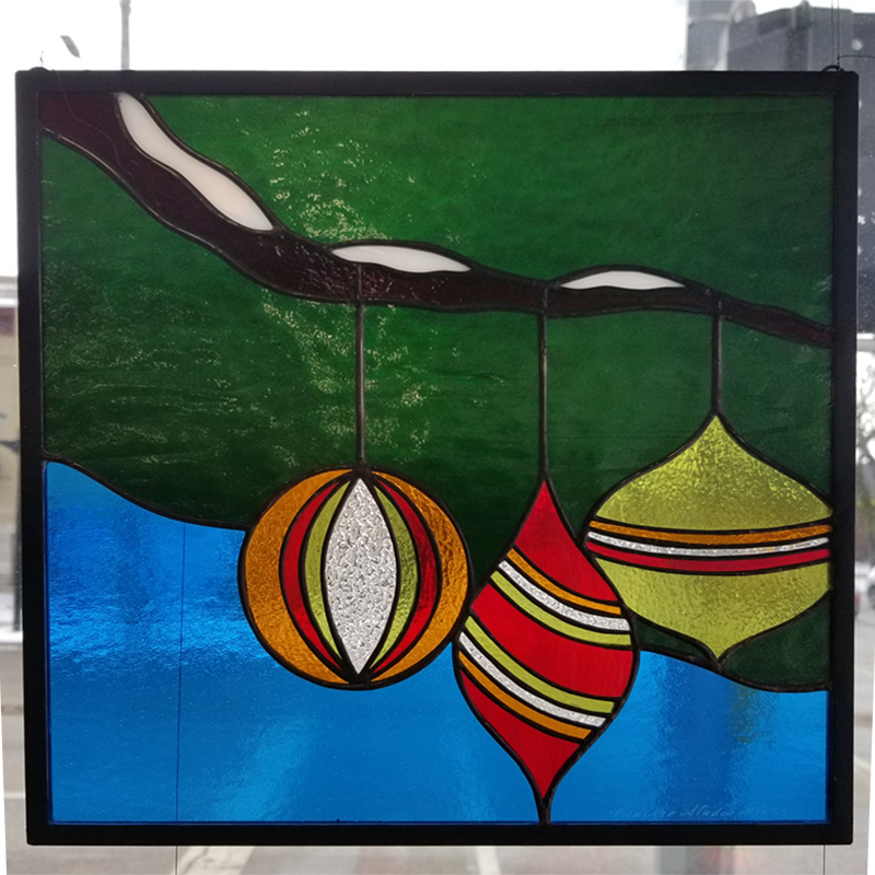 This design features a trio of classic holiday ornaments, in amber, red, lime green and clear with an iridescent finish, hung from a snowy branch. Hand rolled glass is used throughout.