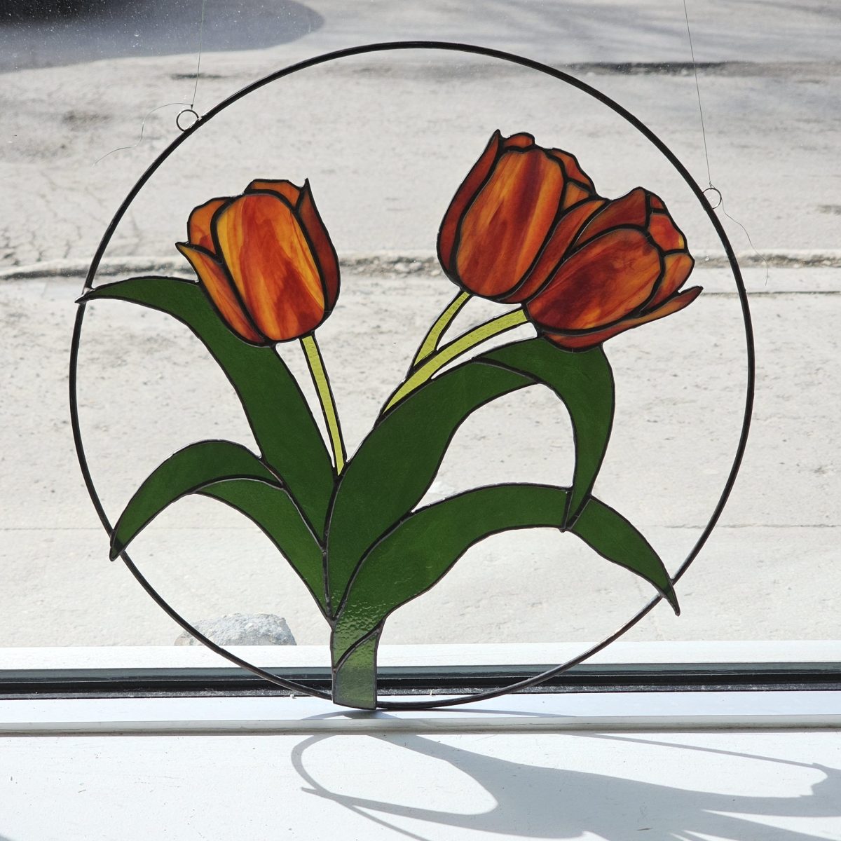 This piece features an elegant mix of hand rolled glass throughout. The flowers are a gorgeous mix of red and soft yellow, the foliage is a deep rich green and the stems are soft green, all set into a brass ring. This piece will bring a little piece of spring to any space!